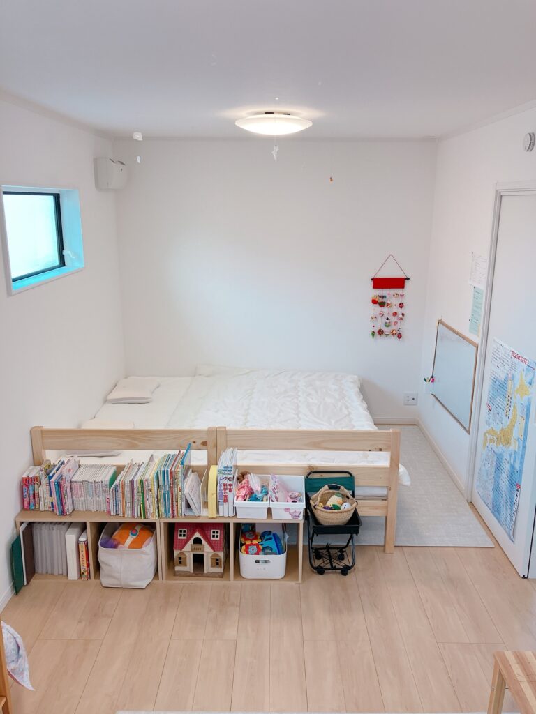 幼児期は机やベッドは不要。せっかく9畳の広さがあるので、部屋の半分はおもちゃ・絵本を中心に置き、もう半分は体を動かして遊べるようにゾーン分けしました。